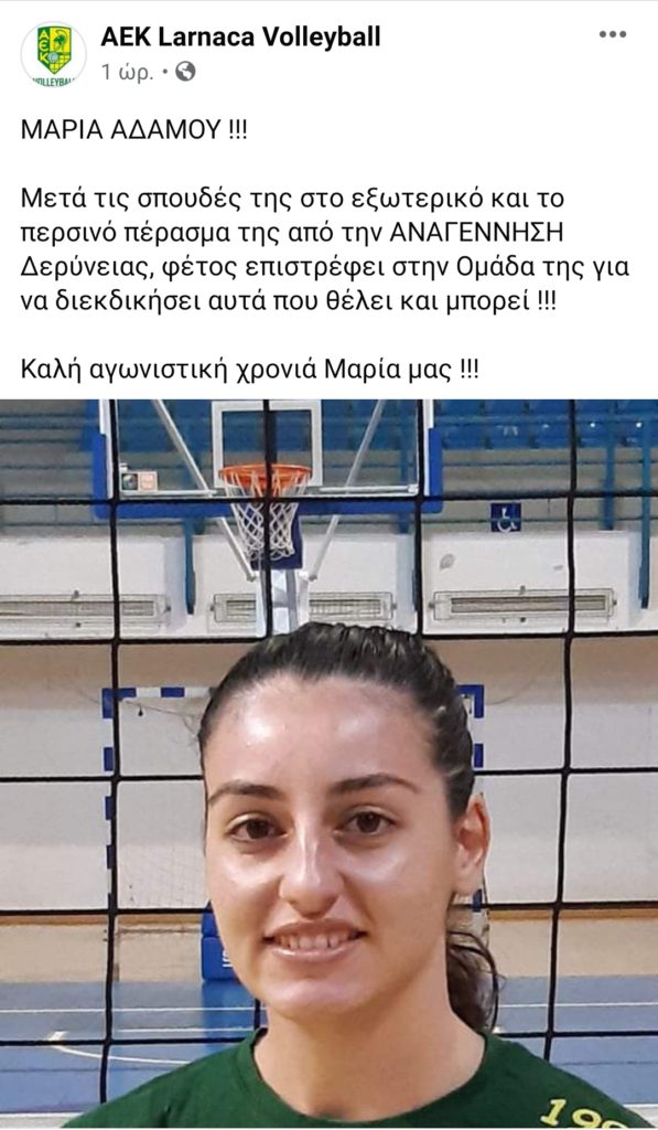 TOP STORIES / ΒΟΛΕΪΜεταγραφή-Επιστροφή για την ομάδα μας (ΑΝΑΚΟΙΝΩΣΗ) Τετάρτη, 25 Αυγούστου 2021, 20:42Τετάρτη, 25 Αυγούστου 2021, 20:42 ShareTweet Η πετοσφαιρική μας ομάδα ανακοίνωσε την απόκτηση της Μαρίας Αδάμου. Μετά τις σπουδές της και τον ένα χρόνο στην Αναγέννηση, επιστρέφει στην ομάδα της καρδιάς της. Καλή αγωνιστική σεζόν Μαρία μας! Η ανακοίνωση: Κωνσταντίνος Κούλας