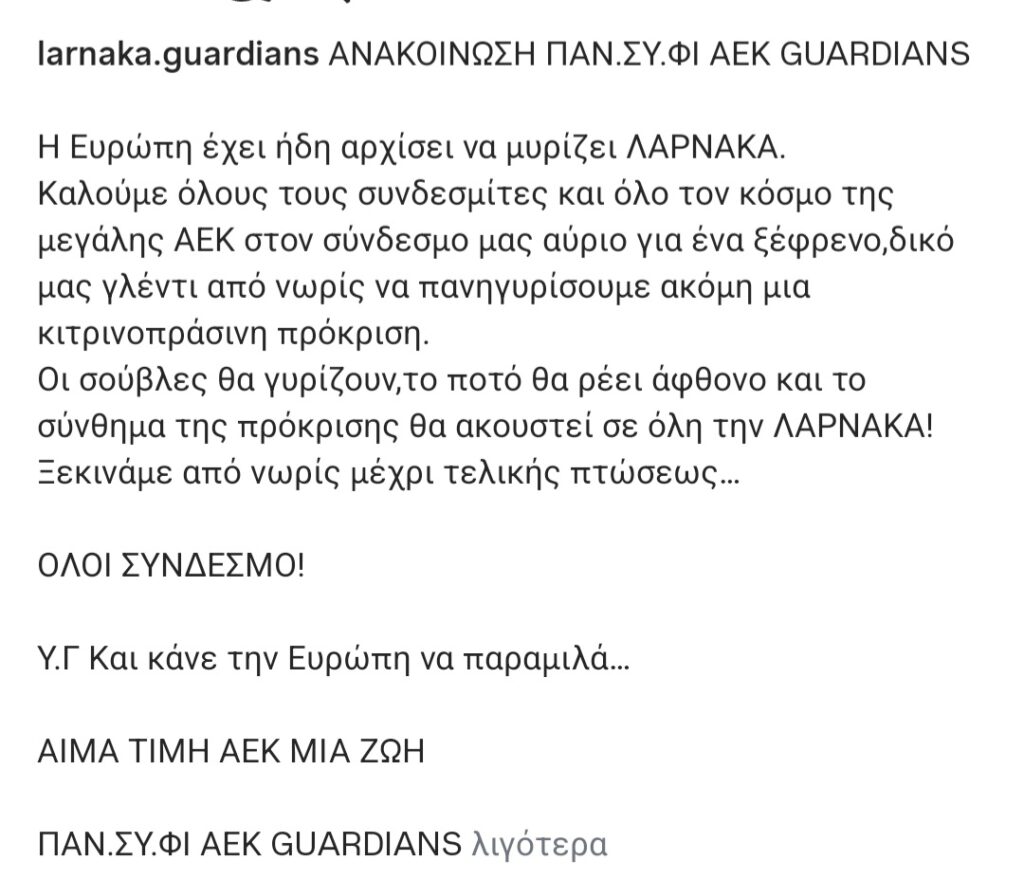TOP STORIES / ΠΟΔΟΣΦΑΙΡΟ“Η Ευρώπη άρχισε να μυρίζει Λάρνακα” Πέμπτη, 14 Αυγούστου 2025, 0:04Πέμπτη, 14 Αυγούστου 2025, 0:04 ShareTweet Οι οργανωμένοι της ΑΕΚ μας προχώρησαν σε ανάρτηση αναφορικά με το παιχνίδι κόντρα στη Λέγκια στην Πολωνία. Αναλυτικά: