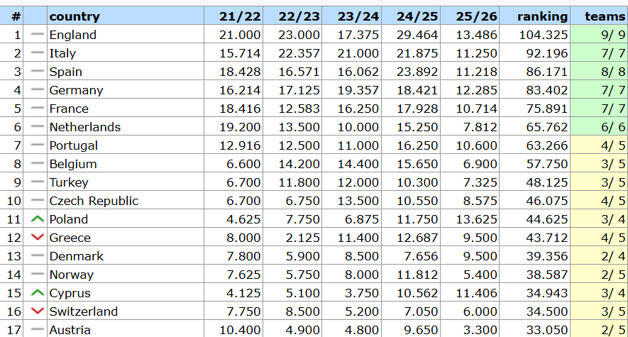 Μετά τη νίκη της ΑΕΚ μας, που προκρίθηκε απευθείας στους «16» του Conference League και την ήττα της Ομόνοιας η οποία όμως πέρασε στην φάση των νοκ-άουτ, η Κύπρος από την 16η θέση της UEFA ανέβηκε στην 15η.