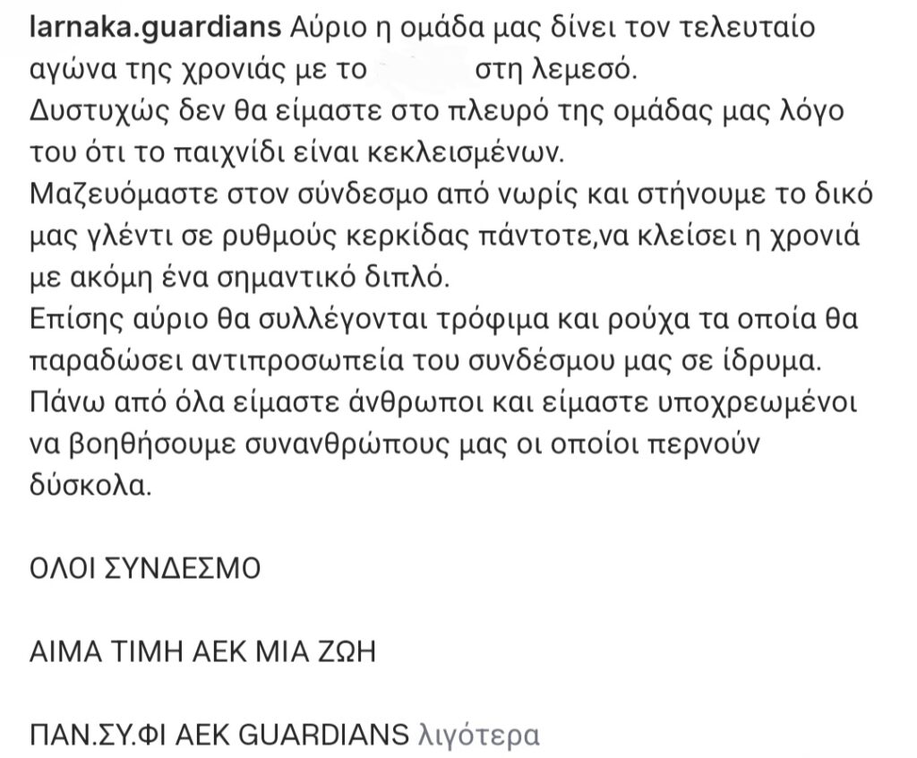 TOP STORIES / ΠΟΔΟΣΦΑΙΡΟΤο ματς στον σύνδεσμο και τα είδη πρώτης ανάγκης που θα συλλέξουμε Κυριακή, 21 Δεκεμβρίου 2025, 17:04Κυριακή, 21 Δεκεμβρίου 2025, 17:04 ShareTweet Οι οργανωμένοι της ομάδας μας προχώρησαν στην πιο κάτω ανάρτηση αναφορικά με το παιχνίδι κόντρα στην ΑΕΛ στη Λεμεσό. Αναλυτικά: