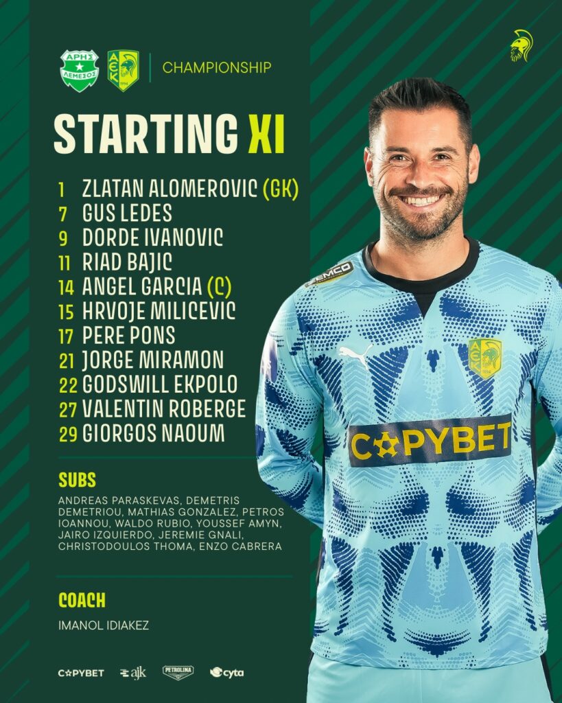Η ομάδα μας αντιμετωπίζει τον Άρη στη Λεμεσό για την 17η αγωνιστική και πιο κάτω μπορείτε να δείτε την εντεκάδα που επέλεξε ο Ιδιάκεθ.