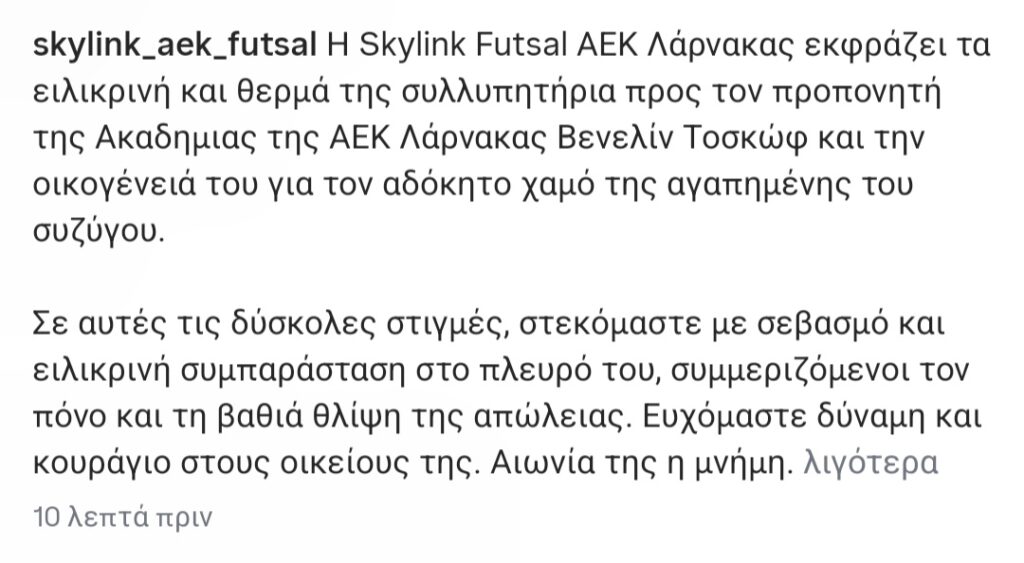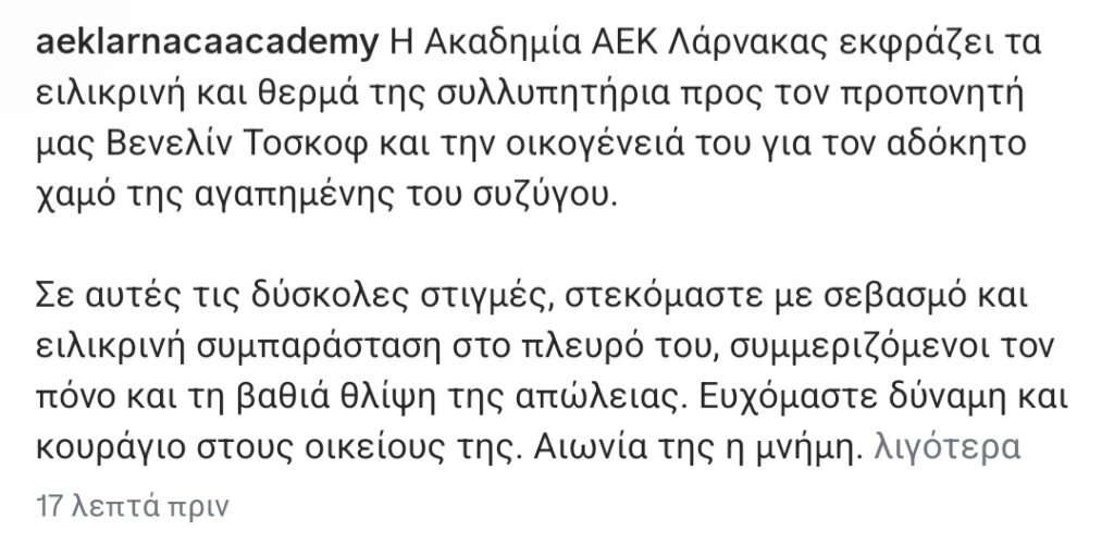 TOP STORIES / ΑΚΑΔΗΜΙΕΣ / ΠΟΔΟΣΦΑΙΡΟΘλίψη για τον χαμό της συζύγου του Βενελίν Τοσκώφ Πέμπτη, 22 Ιανουαρίου 2026, 12:30Πέμπτη, 22 Ιανουαρίου 2026, 12:30 ShareTweet Η ποδοσφαιρική ακαδημία μας και το τμήμα φούτσαλ εκφράζουν τα συλλυπητήριά τους για τον χαμό της συζύγου του προπονητή Βενελίν Τοσκώφ. Αναλυτικά: