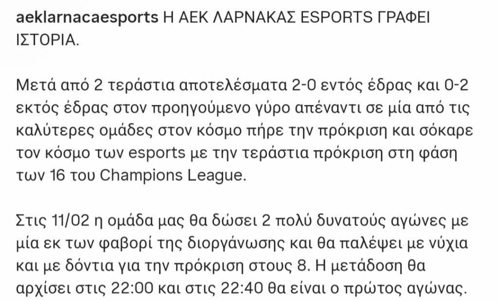 ESPORTS / TOP STORIESΗ ομάδα μας στους 16 του Τσάμπιονς Λιγκ! Δευτέρα, 9 Φεβρουαρίου 2026, 20:19Δευτέρα, 9 Φεβρουαρίου 2026, 20:19 ShareTweet Το τμήμα esports μας είναι στους 16 του Τσάμπιονς Λιγκ και στις 11/2 θα παίξει δύο πολύ σημαντικούς αγώνες. Αναλυτικά: