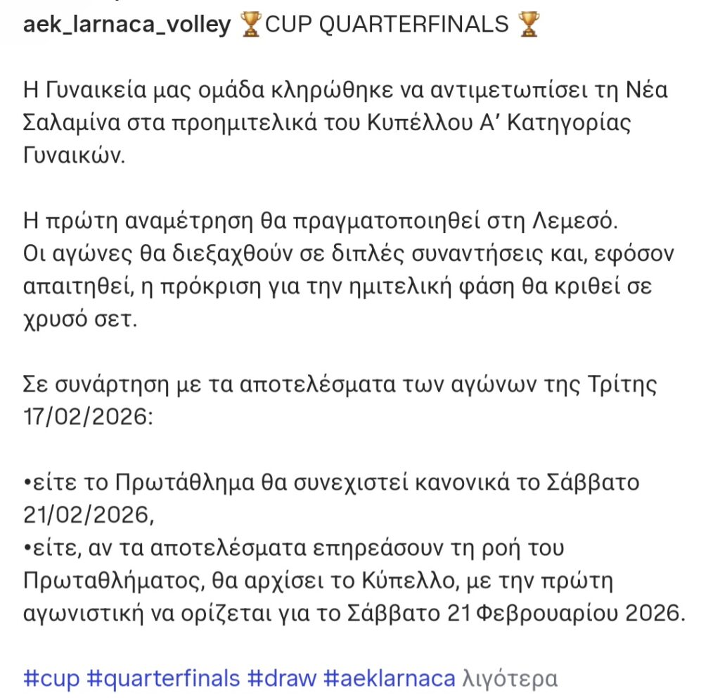 TOP STORIES / ΒΟΛΕΪΜε Νέα Σαλαμίνα στο Κύπελλο Σάββατο, 14 Φεβρουαρίου 2026, 12:18Σάββατο, 14 Φεβρουαρίου 2026, 12:18 ShareTweet Η ομάδα μας στην πετόσφαιρα θα παίξει στα προημιτελικά του Κυπέλλου με τη Νέα Σαλαμίνα. Αναλυτικά: