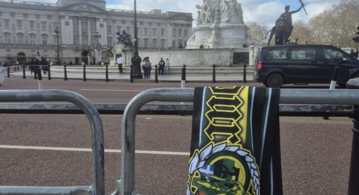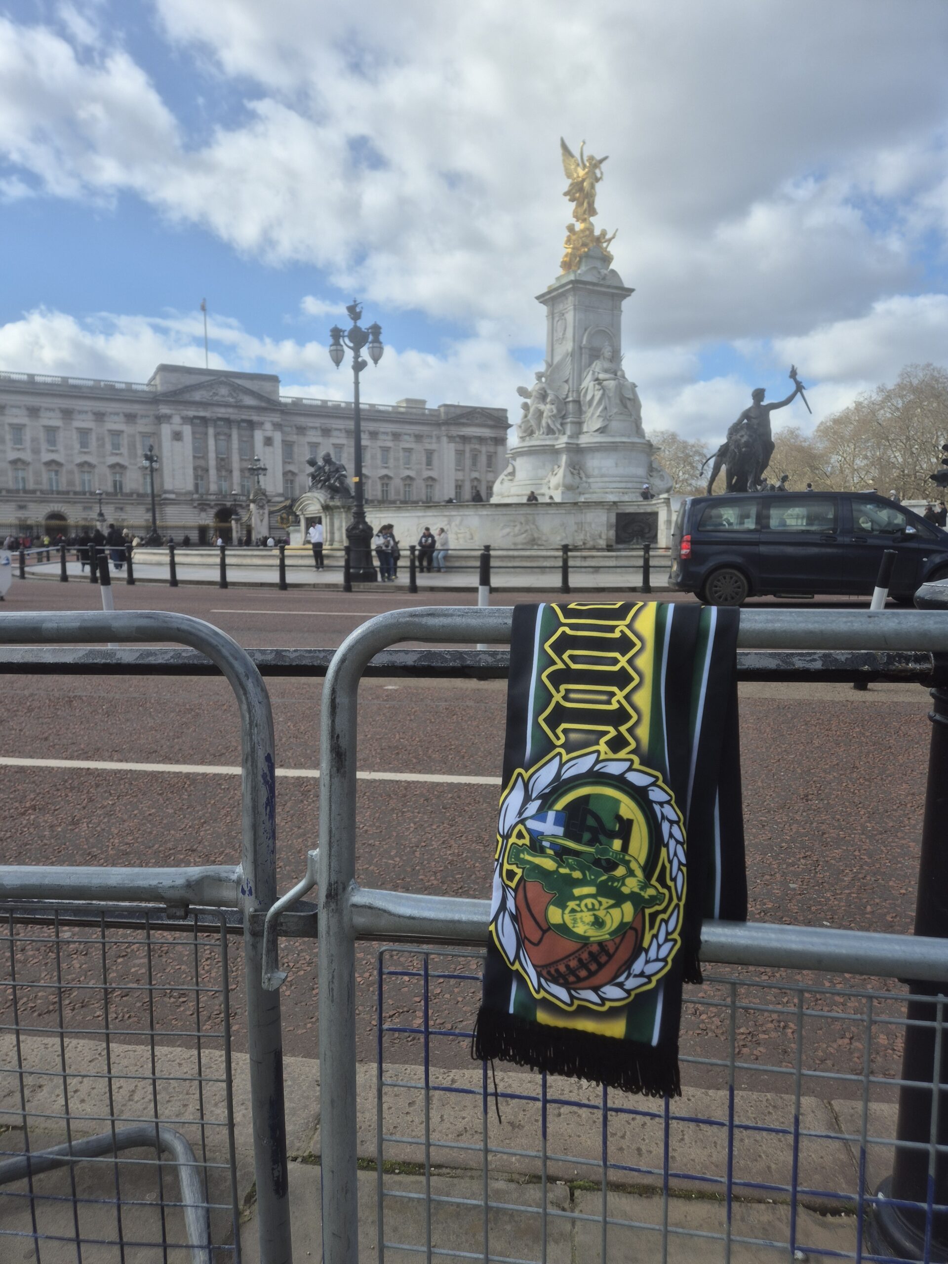 Το κασκόλ της ομάδας μας με φόντο το Buckingham Palace.